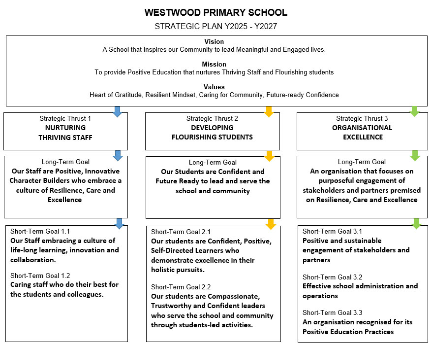 In 2021, under the Leadership of our second Principal, Mr Andrew Mah, Westwood Primary School embarked on reviewing and refreshing our Vision, Mission and Strategic Directions. After a series of focused group discussions with staff, students, parents and stakeholders on what we envision a Westwoodian to be like after six years of experiencing a Uniquely Westwood Experience, our Strategic Plan for our next lap was conceptualized and launched. The refreshed directions sharpens Westwood’s focus on continuing our Innovation in developing a Holistic, Student-Centric Academic Curriculum as well as synergizing various MOE initiatives and school-based innovations into a cohesive Character Education Programme centering on MOE’s Character and Citizenship Education (CCE) 2021 curriculum and our Positive Education Programme.